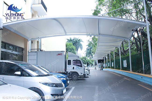 學校膜結構遮陽棚,能突顯出學校新型建筑方面的魅力,造型新穎美觀,是學校里就是一道漂亮的景觀,還能是學校的門廊遮陽棚。這次的執信中學案例中,以學校大門下實際所需,安裝上遮陽棚是為了能連接于學校樓,這樣方便了出入,不僅能為學校學生遮陽遮雨出入。能彰顯出了它本身在學校的大大實用性。