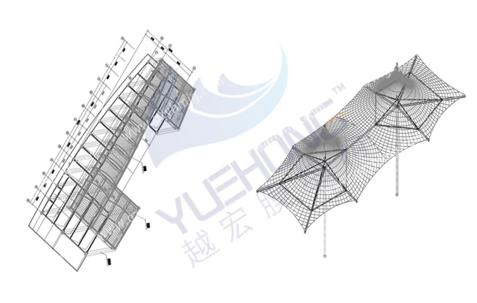 越宏膜結(jié)構(gòu)廠家的景觀膜結(jié)構(gòu)是由鋼結(jié)構(gòu)和膜材組成,分別有張拉式膜結(jié)構(gòu)、索膜結(jié)構(gòu)、骨架式膜結(jié)構(gòu)、空間結(jié)構(gòu)樣式供選擇,根據(jù)不同場(chǎng)景進(jìn)行設(shè)計(jì)出個(gè)性化膜結(jié)構(gòu)。